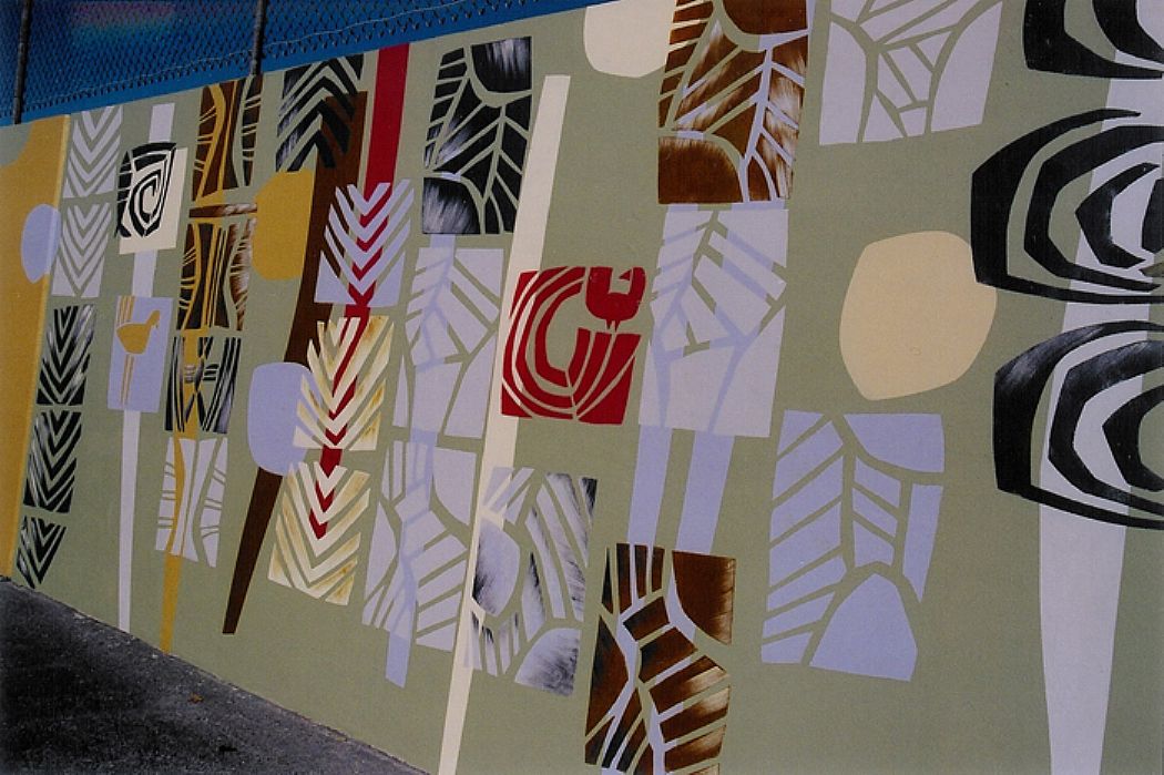 "Tapestry" is a mural about movement, energized by shimmering color relationships and crisp patterns. Along the course of a slowly curving 280 linear ft wall, the tapestry of improvisations unfurls in a music-like progression. Commissioned by TriMet and the Regional Arts and Culture Council. Sited adjacent to a Park and Ride lot.