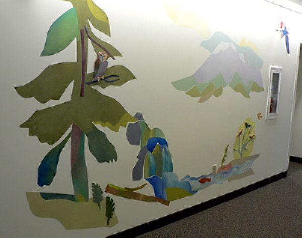 Art with a therapeutic intention both enlivens and relaxes young patients, parents, and caregivers. Four hallway murals bring archetypal regional landscapes inside. A collection of paintings on panels provide welcome and warmth to the waiting area and reception counter. All childrens' rooms are personalized with a lively stenciled border on an accent color wall. The 12-unit inpatient facility in St. Vincent's new East Tower is Washington County's first for pediatric care.