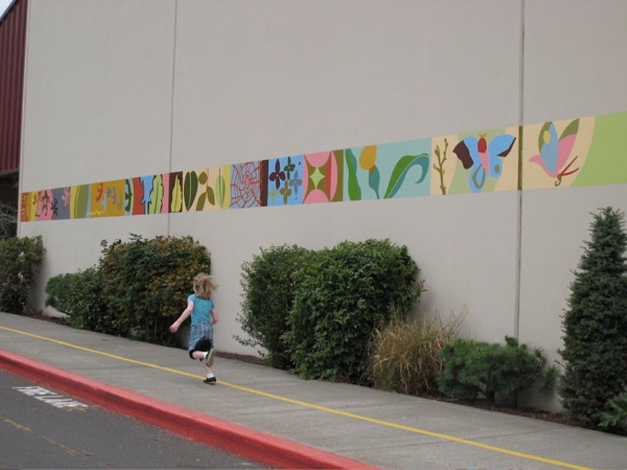 | This colorful frieze unfurls itself in 3 sections (250 feet in length), encompassing the school's main entryway. "River of Life" is a playful weaving together of regional nature images and abstract motifs. The artwork declares to children, parents, and staff that learning at Durham is a vibrant, inviting adventure. |