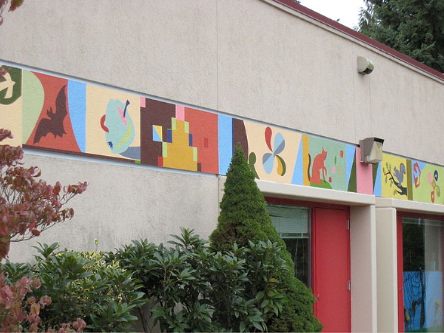 | This colorful frieze unfurls itself in 3 sections (250 feet in length), encompassing the school's main entryway. "River of Life" is a playful weaving together of regional nature images and abstract motifs. The artwork declares to children, parents, and staff that learning at Durham is a vibrant, inviting adventure. |