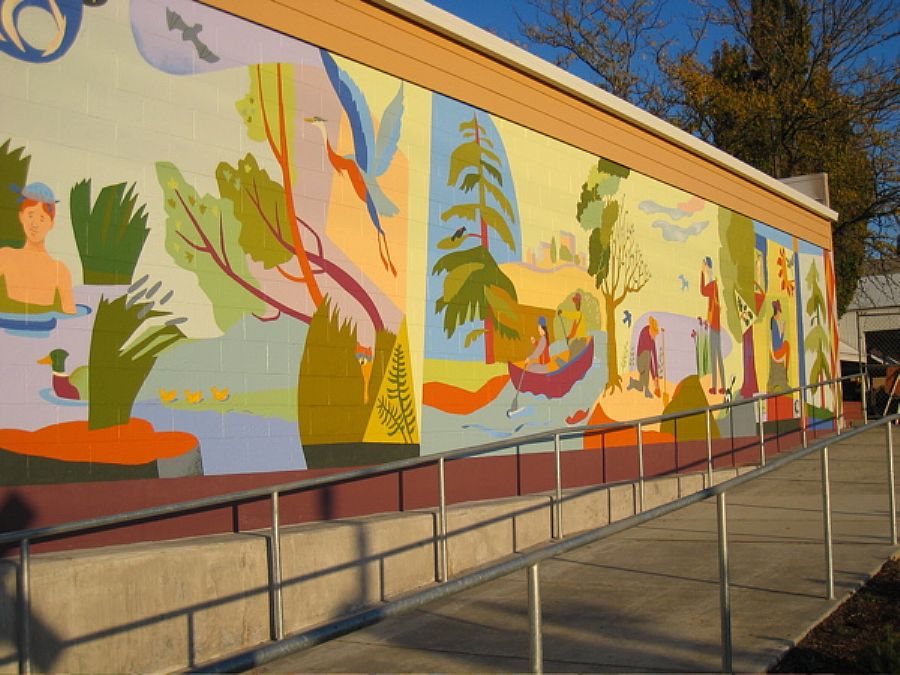 "Rivers" is a panoramic mural of people enjoying and caring for the natural riches found in the Tualatin watershed. The design sparkles with the play of lively color and pattern.