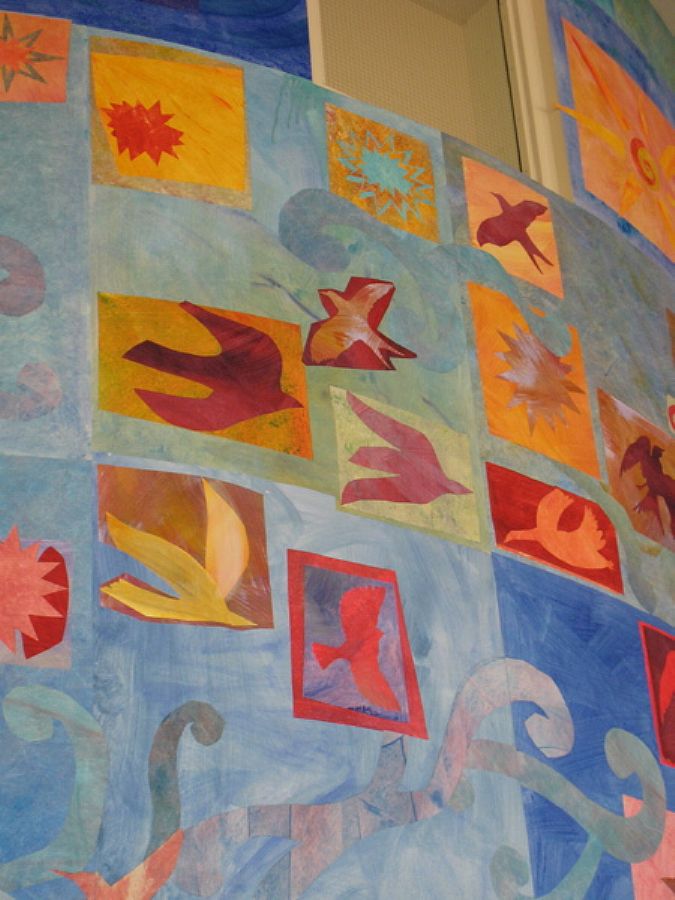 The mural is actually a large-scale collage of cut sheets of acrylic-painted tyvek , a synthetic paper-like product. The art site is the Academy's entrance lobby. The azure sky scene emblazened with birds of all feathers, stars, and suns evokes the space of imagination, swarming with inspirations.
