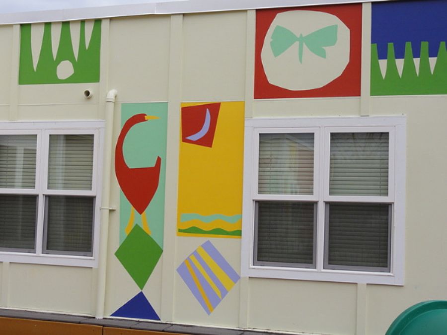 Kelley Wilson, architect for this rural pre-school contacted us after seeing our "painted architecture" for Tabor Commons. This facility, a functional arrangement of manufactured units painted in large blocks of bright colors, set the stage for our extended mural.