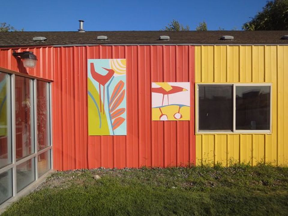 We provided a plan to break up the singular building mass into rhythmic sequences of four colors. Onto this we integrated a menagerie of fanciful animals, flowers, and plants. The 14 panels of diverse dimensions are 1/8" aluminum sheets. We used industrial strength direct to metal paints.
