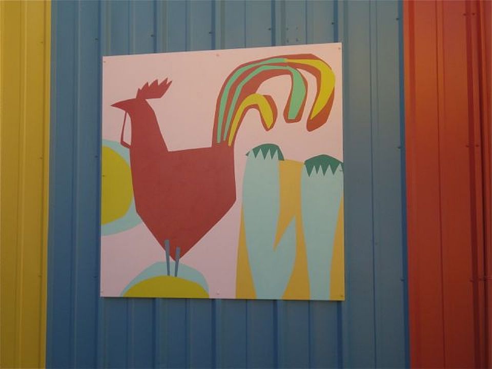 We provided a plan to break up the singular building mass into rhythmic sequences of four colors. Onto this we integrated a menagerie of fanciful animals, flowers, and plants. The 14 panels of diverse dimensions are 1/8" aluminum sheets. We used industrial strength direct to metal paints.