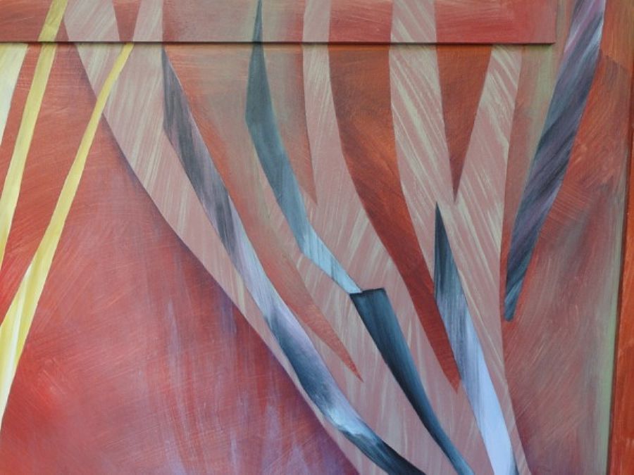 Our clients, recent transplants from New England, were in love with the San Francisco Bay Area's climate and abundant gardens of Mediterranean plants. The murals are a poetic interpretation of this magical environment. Working with layers of red glazes, a rich warm ground for the design was developed. The large forms and gestures of plants were then freely brushed on. Stencils of smaller leaf and flower shapes completed the composition.