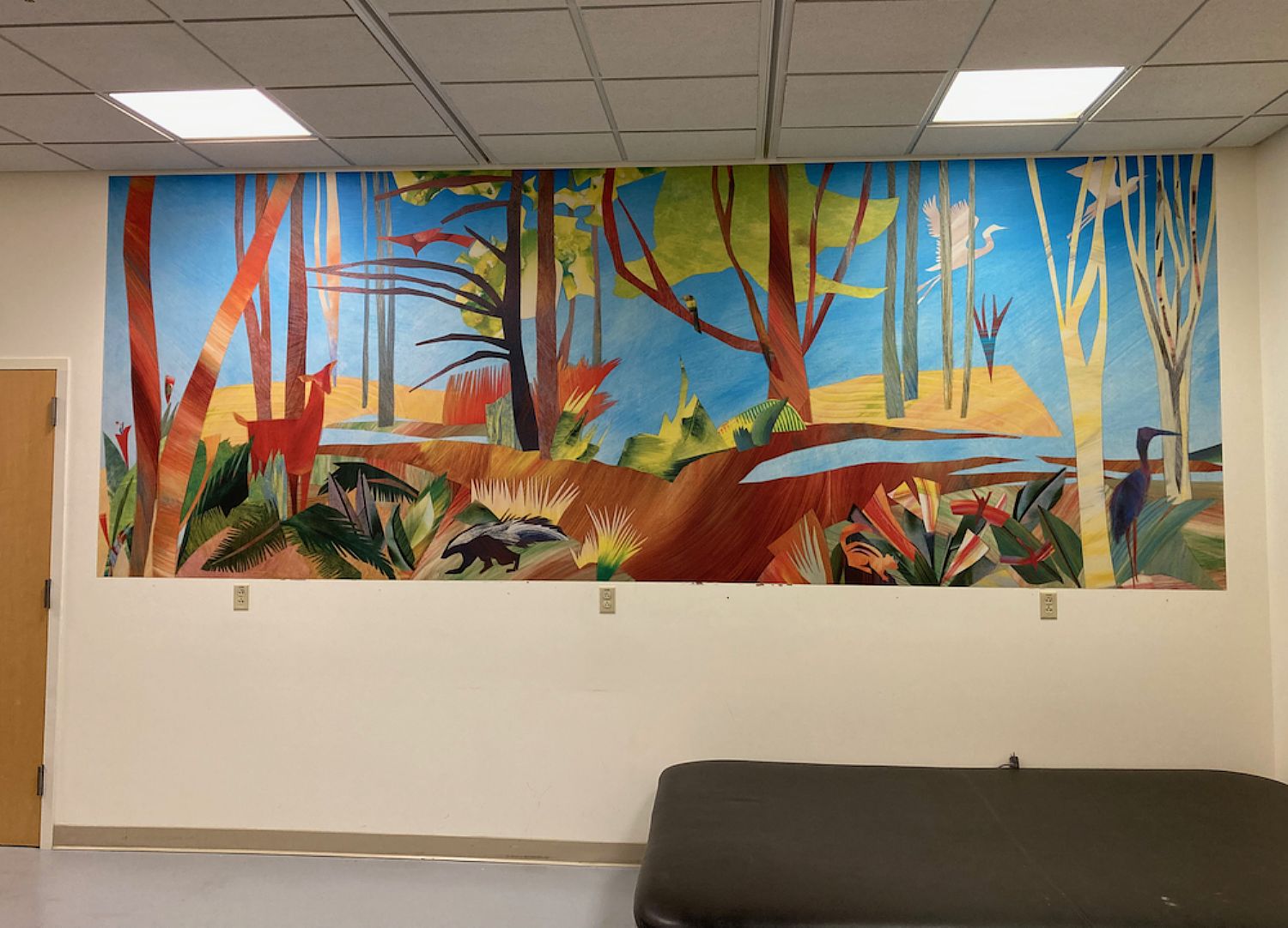 In creating a mural for this Physical Therapy Gym, Site Painters proposed making a design that could be scanned and transferred to acrovyn panels for installation. The artwork began as an elaborate collage using hand-painted papers. In such a spacious room there were plenty of opportunities to include a wide variety of plant life and native creatures. The design invites on-going patient exploration and is both encouraging and healing.