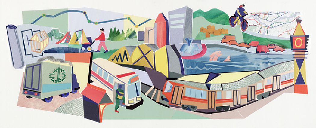 | Oregon’s land-use and transportation planning initiatives have led the nation for more than 20 years, and the regional government, METRO, has been at the forefront. SitePainters was responsible for the mural on a traveling bus exhibit featuring the finer points of METRO’s land-use and transportation planning goals. Mural images were also used on interactive computer stations and brochures. |