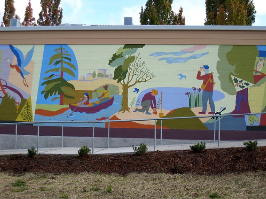 "Rivers" is a panoramic mural of people enjoying and caring for the natural riches found in the Tualatin watershed. The design sparkles with the play of lively color and pattern.