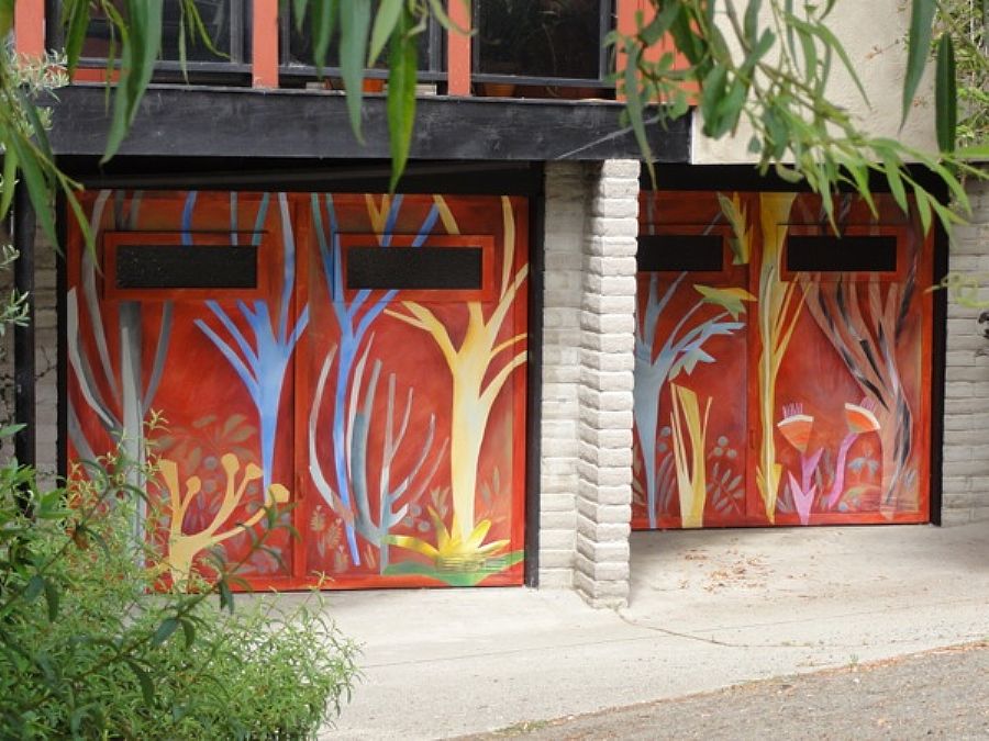 Our clients, recent transplants from New England, were in love with the San Francisco Bay Area's climate and abundant gardens of Mediterranean plants. The murals are a poetic interpretation of this magical environment. Working with layers of red glazes, a rich warm ground for the design was developed. The large forms and gestures of plants were then freely brushed on. Stencils of smaller leaf and flower shapes completed the composition.