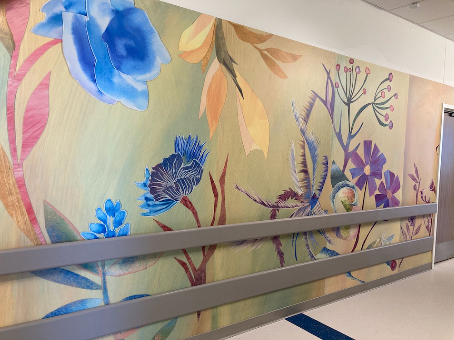 The twelve floors of the new Women's and Children's Hospital in San Antonio are filled with art. Site Painters was commissioned to create art for 2 of these floors. The theme In Bloom (chosen by the hospital) inspired numerous compositions of flowering plants. Using collages of painted papers, block prints, gouache renderings, and stenciled images, designs were made for corridors, patient rooms, exam and triage rooms. These were scanned at high resolution and printed on acrovyn panels. The installations bring soothing and welcoming colors into the environment with lyrical depictions of flowers and plants, enriching the visual experience for patients, families, and hospital staff.