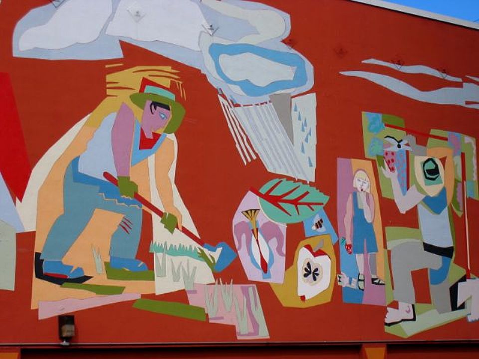| "From Seed to Celebration," an 18'x 80' mural narrating the cycle of planting, cultivating, harvesting, marketing, and enjoying food. The bold design, based on collage, is easily 'readable' by passing cars and shoppers approaching from the parking lot. A neighborhood landmark. |