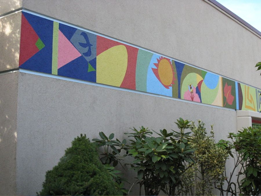 | This colorful frieze unfurls itself in 3 sections (250 feet in length), encompassing the school's main entryway. "River of Life" is a playful weaving together of regional nature images and abstract motifs. The artwork declares to children, parents, and staff that learning at Durham is a vibrant, inviting adventure. |