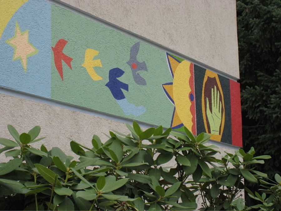 | This colorful frieze unfurls itself in 3 sections (250 feet in length), encompassing the school's main entryway. "River of Life" is a playful weaving together of regional nature images and abstract motifs. The artwork declares to children, parents, and staff that learning at Durham is a vibrant, inviting adventure. |