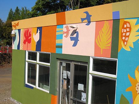 This vibrant mural based on paper collage designs serves to unify and enlarge the presence of this non-profit Community Center in the making. Drawing on garden and bird imagery, the mural uses a carefully composed arrangement of shapes to create an architecture of color .