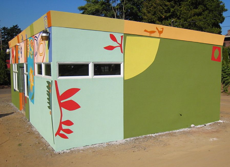 This vibrant mural based on paper collage designs serves to unify and enlarge the presence of this non-profit Community Center in the making. Drawing on garden and bird imagery, the mural uses a carefully composed arrangement of shapes to create an architecture of color .