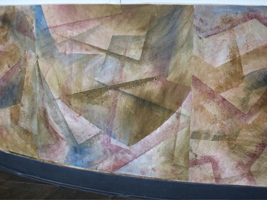 The mural is actually a large-scale collage of cut sheets of acrylic-painted tyvek , a synthetic paper-like product. The art site is the Academy's entrance lobby. The azure sky scene emblazened with birds of all feathers, stars, and suns evokes the space of imagination, swarming with inspirations.