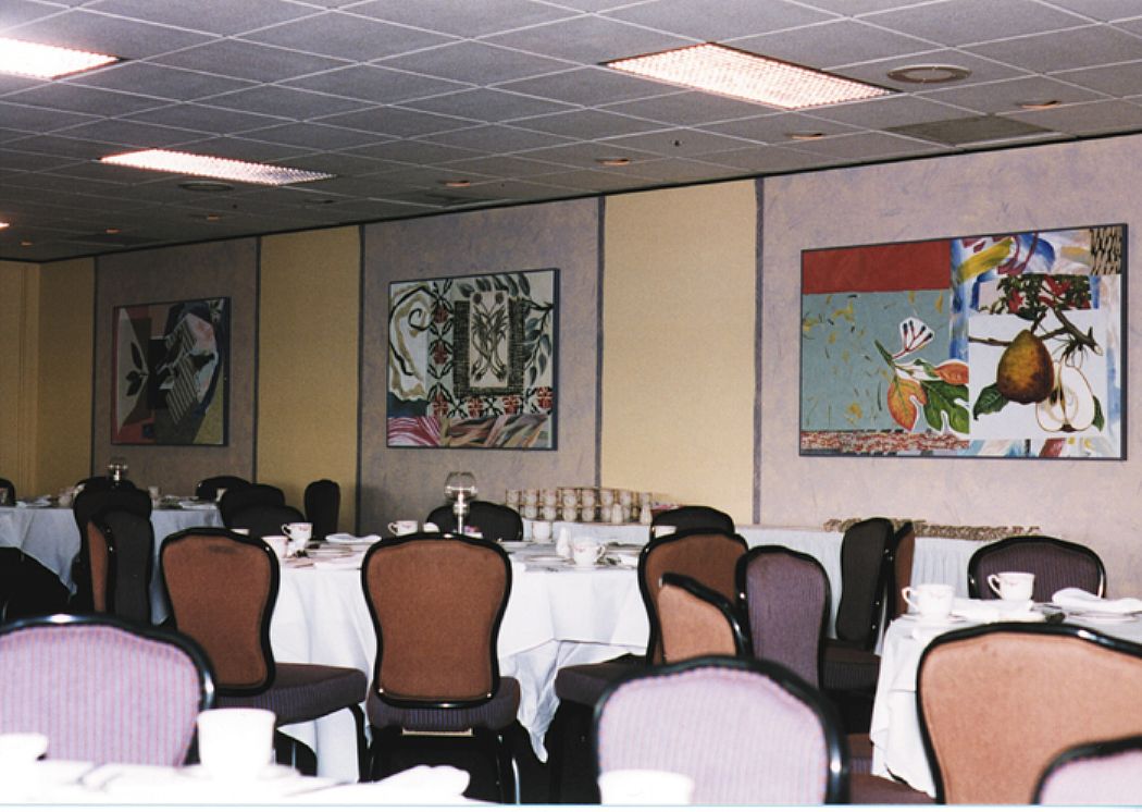 | A formerly generic banquet facility redefined by a collection of thirteen vibrant paintings (average 3' x 4' each) based on paper collage designs. Site Painters set a new stage for the installation of these durable wood panels with a wall color plan, paint finishes and borders. Dinner and an elegant gallery experience. |