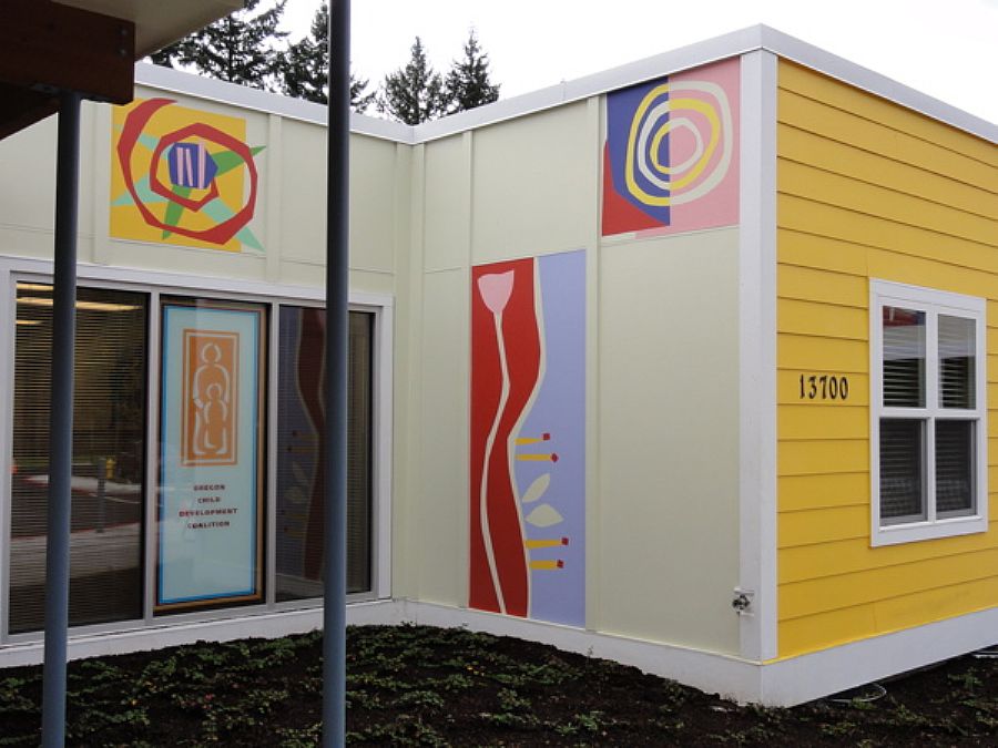 Kelley Wilson, architect for this rural pre-school contacted us after seeing our "painted architecture" for Tabor Commons. This facility, a functional arrangement of manufactured units painted in large blocks of bright colors, set the stage for our extended mural.