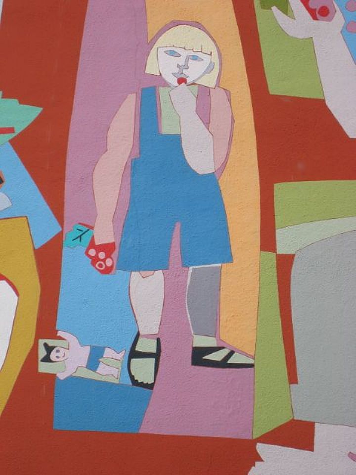 | "From Seed to Celebration," an 18'x 80' mural narrating the cycle of planting, cultivating, harvesting, marketing, and enjoying food. The bold design, based on collage, is easily 'readable' by passing cars and shoppers approaching from the parking lot. A neighborhood landmark. |