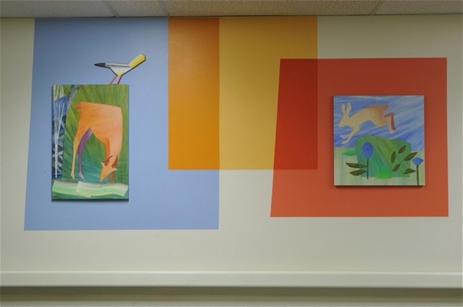 St. Vincents has expanded their Pediatrics In-Patient capacity and initiated a new Pediatrics ICU. The walls of the two intermingled facilities were a blank slate. We chose a signature color palette for the series of overlapping rectangles painted throughout the halls. These compositions became the context for mounting a menagerie of collage-based creature designs on panels with supporting cut-out figures. Art sites included two age specific play/recreation rooms, an exam room, conference room, and two nurses stations -- one highlighting the new PICU, 35 paintings in all.