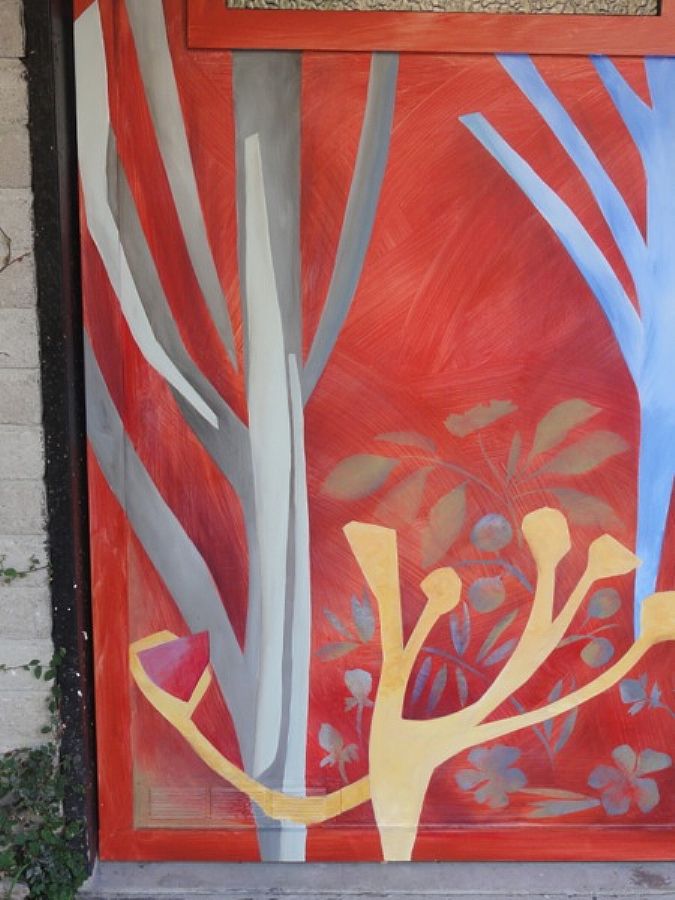 Our clients, recent transplants from New England, were in love with the San Francisco Bay Area's climate and abundant gardens of Mediterranean plants. The murals are a poetic interpretation of this magical environment. Working with layers of red glazes, a rich warm ground for the design was developed. The large forms and gestures of plants were then freely brushed on. Stencils of smaller leaf and flower shapes completed the composition.