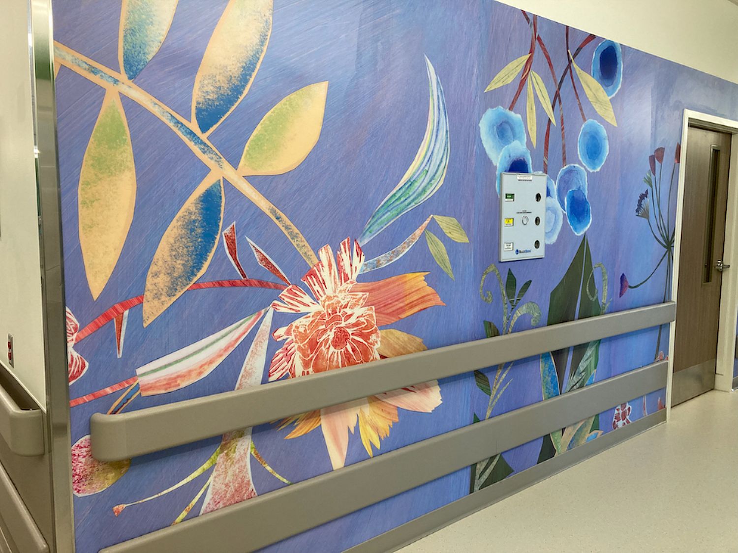 The twelve floors of the new Women's and Children's Hospital in San Antonio are filled with art. Site Painters was commissioned to create art for 2 of these floors. The theme In Bloom (chosen by the hospital) inspired numerous compositions of flowering plants. Using collages of painted papers, block prints, gouache renderings, and stenciled images, designs were made for corridors, patient rooms, exam and triage rooms. These were scanned at high resolution and printed on acrovyn panels. The installations bring soothing and welcoming colors into the environment with lyrical depictions of flowers and plants, enriching the visual experience for patients, families, and hospital staff.