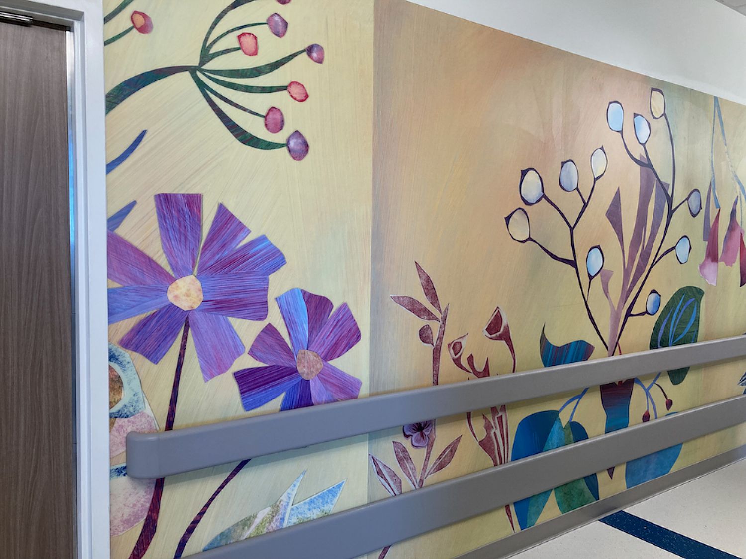 The twelve floors of the new Women's and Children's Hospital in San Antonio are filled with art. Site Painters was commissioned to create art for 2 of these floors. The theme In Bloom (chosen by the hospital) inspired numerous compositions of flowering plants. Using collages of painted papers, block prints, gouache renderings, and stenciled images, designs were made for corridors, patient rooms, exam and triage rooms. These were scanned at high resolution and printed on acrovyn panels. The installations bring soothing and welcoming colors into the environment with lyrical depictions of flowers and plants, enriching the visual experience for patients, families, and hospital staff.