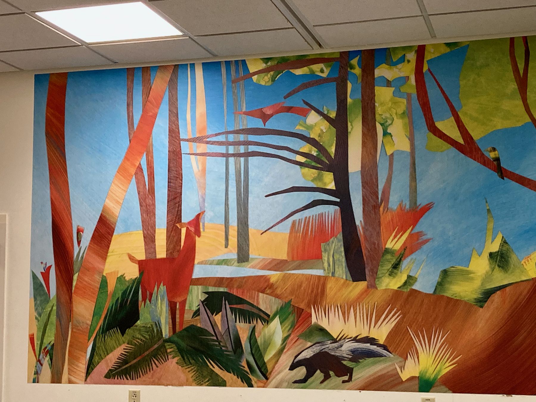 In creating a mural for this Physical Therapy Gym, Site Painters proposed making a design that could be scanned and transferred to acrovyn panels for installation. The artwork began as an elaborate collage using hand-painted papers. In such a spacious room there were plenty of opportunities to include a wide variety of plant life and native creatures. The design invites on-going patient exploration and is both encouraging and healing.