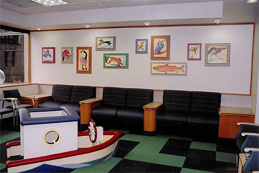 | The Gerry Frank Center for Children's Care chose a Columbia River theme for this new facility. Our plan to realize the concept included a collection of 23 paintings of local creatures, with decorative frames. A river of landscape imagery and applied cut-outs runs through the vestibule and hallway. Custom stenciled borders carry the touch of the natural world into treatment and recovery rooms. Now children and their families see alot more than just the Doctor. |